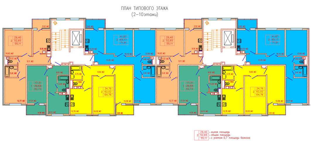 • двухкомнатных – 17 квартир общей площадью 55,11 кв.м., жилой – 52,65 кв.м.;