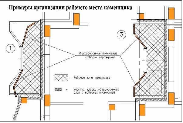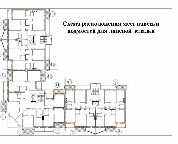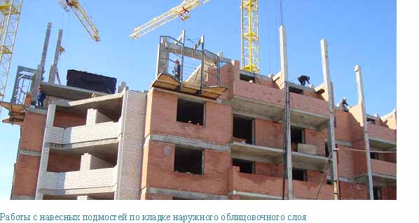 Однако, в отличие от приведенных объектов, строительство жилого дома в г. Орша принципиально отличалось конструкцией трехслойных наружных стен с облицовочным слоем из кирпича. Это, в свою очередь, в значительной мере осложняло выполнение работ по устройству облицовочного слоя, т.к. зона облицовки оказывалась закрытой колоннами прямоугольного сечения. С этой целью были разработаны и успешно применены навесные подмости для работы на проблемных участках наружных стен. Благодаря этому методу была достигнута возможность параллельной работы бригад монтажников и каменщиков.