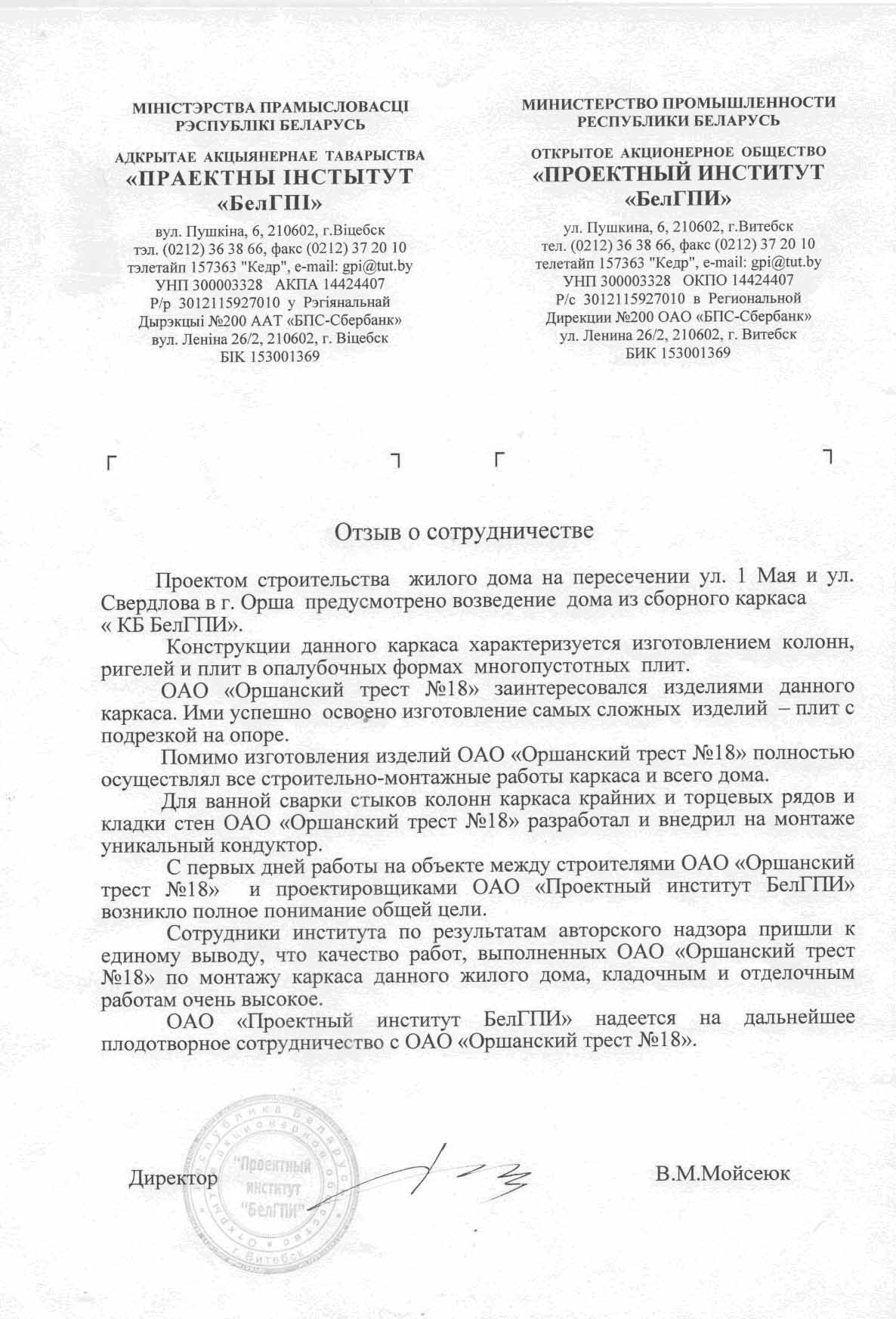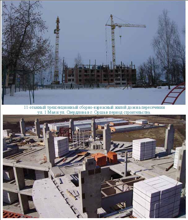 ОАО «Оршанский стройтрест № 18» реализовал проектное решение ОАО «Проектного института БелГПИ», который имеет большой опыт проектных работ в строительном комплексе. На пересечении улиц 1 Мая и Свердлова в г. Орша сдан в эксплуатацию 11-этажный 3-секционный сборно-каркасный жилой дом. В строительстве дома был использован вариант изготовления сборных элементов перекрытий в опалубочных формах многопустотных плит с устройством подрезки опорной части на глубину 115 мм. При проектировании было отдано предпочтение варианту каркасного здания с системой продольных ригелей, которые воспринимают нагрузку, как от плит перекрытия, так и от наружных трехслойных стен поэтажного опирания. При этом потолочная плоскость плит перекрытия совпадает с нижней плоскостью ригелей средней оси здания, что позволяет получить гладкие потолки и, в результате, значительно улучшить эстетическое восприятие внутреннего интерьера квартиры.